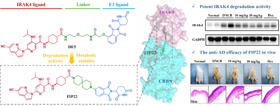 本项研究中,该联合团队以已报道的IRAK4 PROTAC分子DE5为先导物,将刚性连接子策略应用于IRAK4-PROTACs分子设计中,成功发现并系统验证了一种高活性、选择性、代谢稳定的优选化合物FIP22,对 IRAK4的降解活性DC₅₀ 为3.2 nM,相比于先导物提升了115倍。同时,FIP22相较于阳性药KT-474表现出更优的代谢稳定性。在特应性皮炎小鼠模型中,FIP22通过靶向降解IRAK4安全有效地缓解皮炎症状。