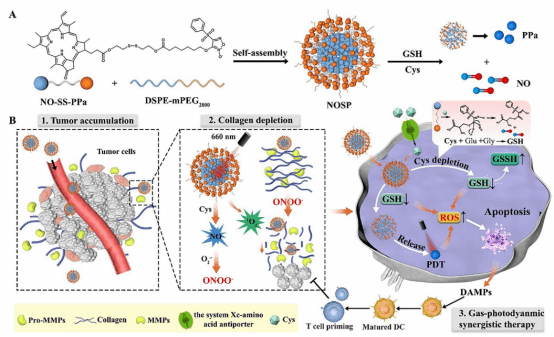 光动力疗法(PDT)是一种非侵入性、高选择性的肿瘤治疗方式,通过激光激活光敏剂产生活性氧(如单线态氧1O2),诱导肿瘤细胞凋亡,并引发免疫原性细胞死亡(ICD)。然而,PDT的疗效受到光敏剂水溶性差导致生物利用度低、肿瘤富集不足、免疫抑制微环境等因素的限制。基于此本研究开发了一种简单的前药纳米组装体,通过二硫键将光敏剂焦脱镁叶绿酸-a(PPa)与呋喃嘧啶(一种消耗半胱氨酸的一氧化氮(NO)供体)连接,构建了PPa的前药纳米组装体。制备的前体药物(NOSP)可与二硬脂酰磷酸乙醇胺-聚乙二醇(DSPE-PEG2000)在水介质中组装形成纳米组装体,使其具有谷胱甘肽(GSH)/半胱氨酸(Cys)双重耗竭能力,用于治疗乳腺癌和肺转移。NOSP进入肿瘤细胞后,可选择性有效响应Cys释放NO。Cys的消耗减少了GSH的产生,而NO的产生可以激活MMPs前体产生活性MMPs并促进纳米颗粒的渗透。NOSP中存在的二硫键消耗肿瘤细胞中的GSH,从而导致抗ROS损伤的氧化还原系统崩溃,增加PDT的抑瘤作用。
